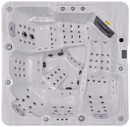 В бассейне оборудован один полноценный лежак, который обеспечивает массаж всего тела от шеи до ступней ног. Также в чаше бассейна обустроено 4 сидячих места. Аэромассажные и гидромассажные форсунки расположены в них в различном порядке. Таким образом, в зависимости от места в чаше бассейна, гидромассажный эффект будет различным. Мягкие подголовники, обустроенные в области шеи, обеспечивают дополнительный комфорт во время массажных процедур. Общее количество форсунок, которыми укомплектован бассейн – 50 штук, из них 10 аэромассажные, то есть через них под большим напором подаётся воздух. Благодаря сочетанию эффекта от гидро- и аэрофорсунок качество массажа улучшается. Пользователи получают максимум удовольствия.