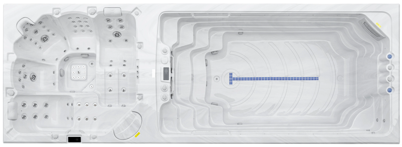 Четыре мощных насоса (два по 2,2 кВт, один 2,2 кВт и один 2,9 кВт) работают в разных зонах, обеспечивая интенсивный массаж 92 форсунками. Уникальная конфигурация гарантирует мощные водные потоки для эффективного массажа и комфортного плавания.